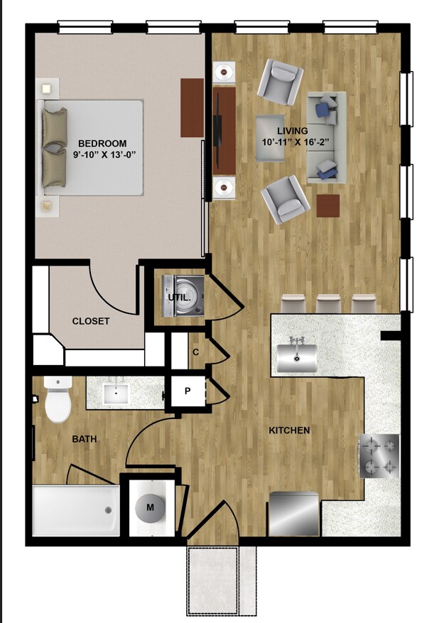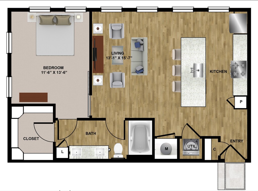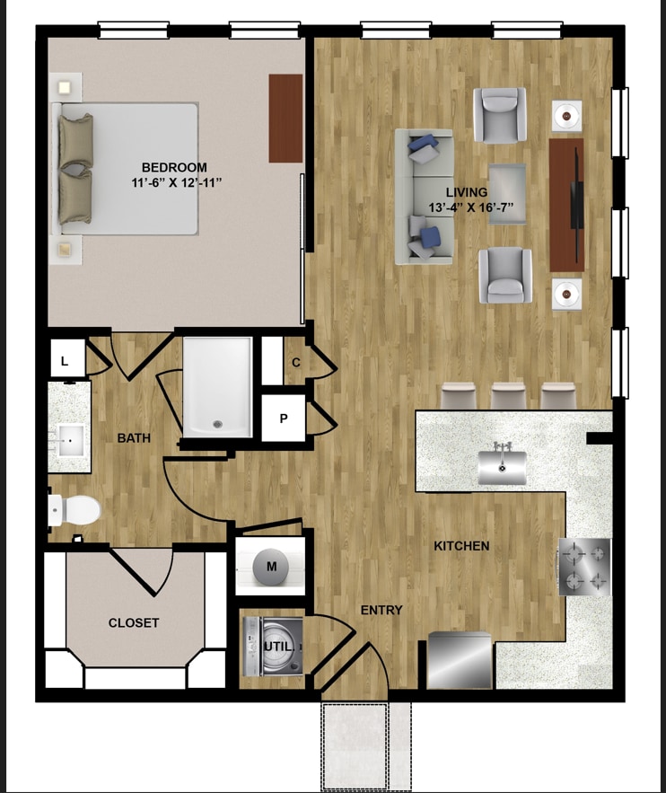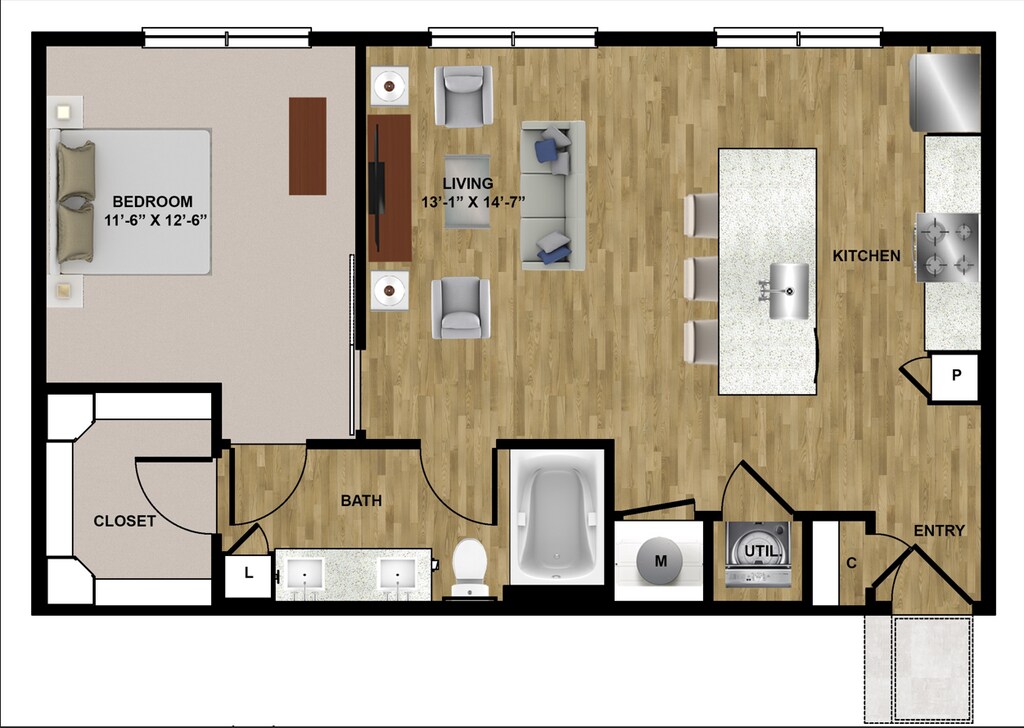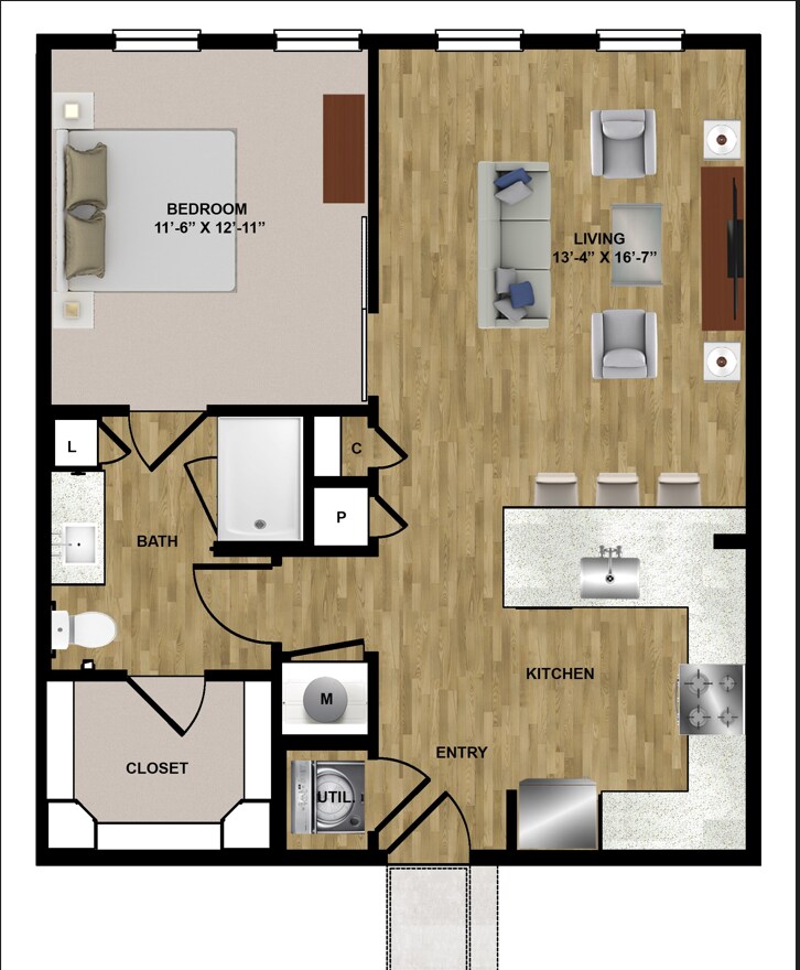 1 Bed, 1 Bath, 614 sq ftAvailable NowModel Gallery