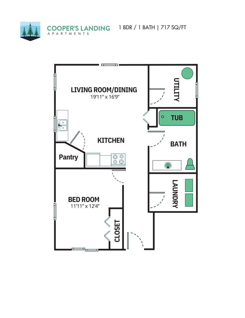 Apartment Model: 1 Bed, 1 Bath - 717 sq ft$1,2481 Bedroom, 1 Bath, 717 sq ftAvailable Now1 Bed, 1 Bath - 717 sq ft - Floorplan 1 1 Bed, 1 Bath - 1004 sq ft