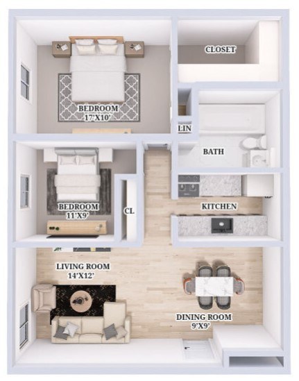 Apartment Model: 2 Bed, 1 Bath$9492 Bedroom, 1 Bath, 825 sq ftAvailable Now![]()