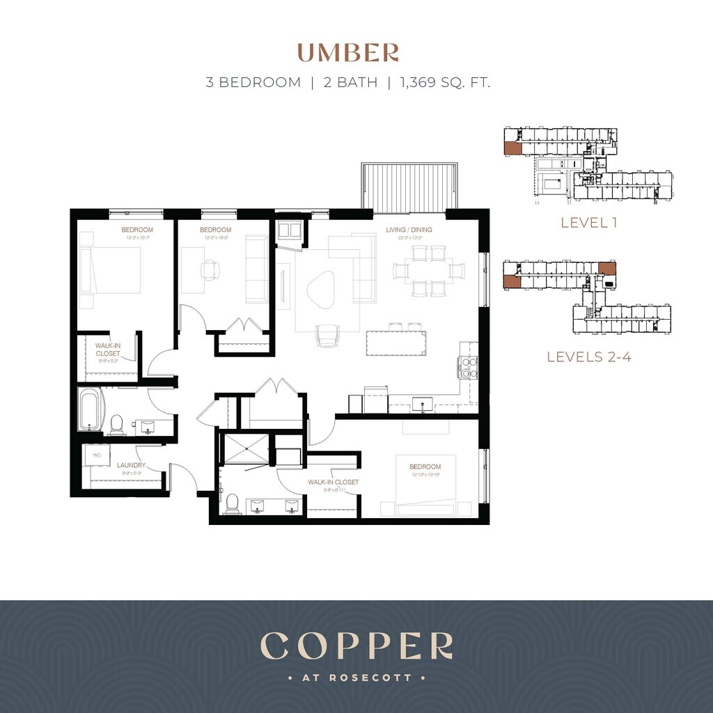 Copper at Rosecott - Opening June! offers Studio to 3 Bedroom apartments starting from $1,385 and having 528–1,692 sq ft. Here is the current pricing and availability: