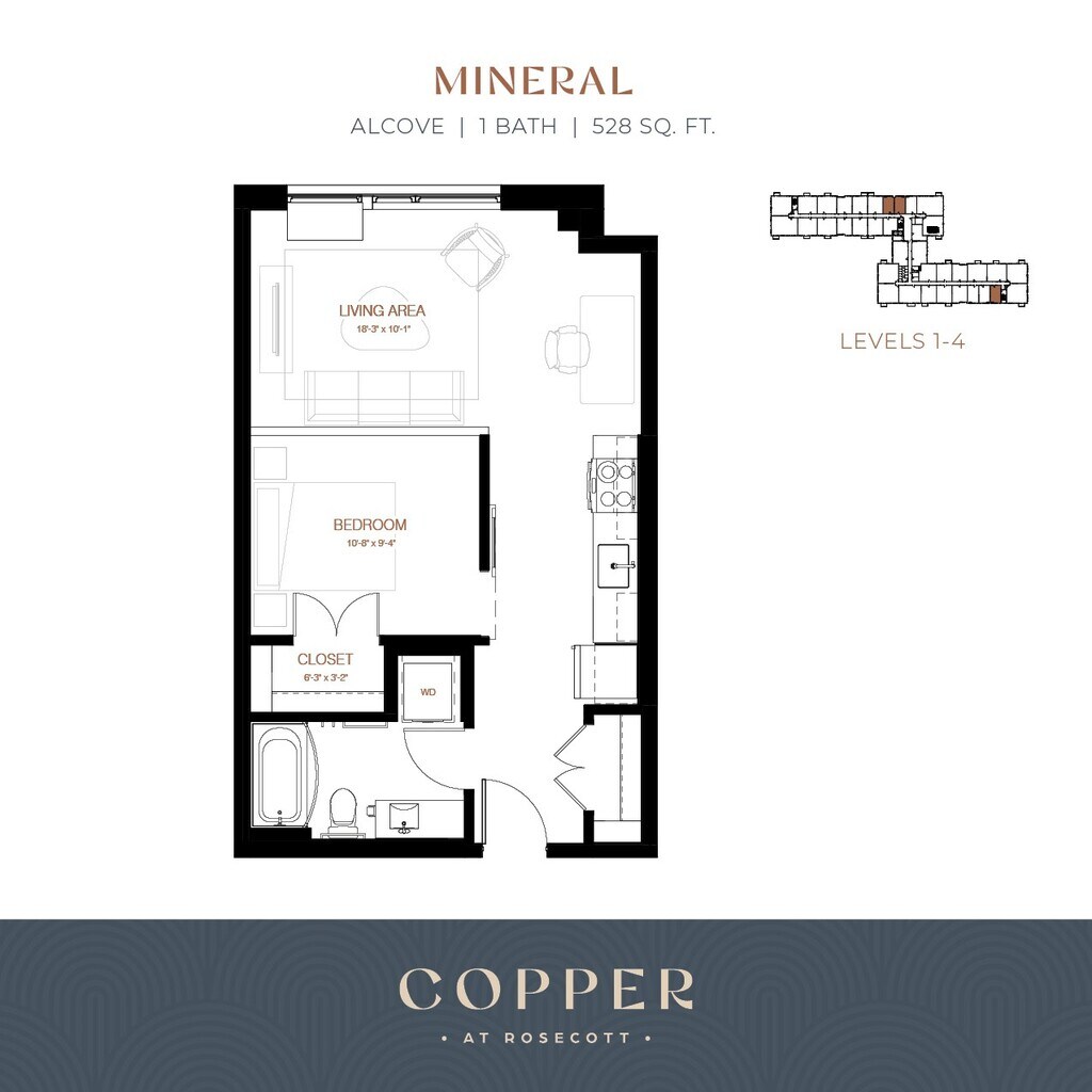 Apartment Model: Mineral - ALCOVEFrom $1,400Studio, 1 Bath, 528 sq ftAvailable June 1, 2026![]()
