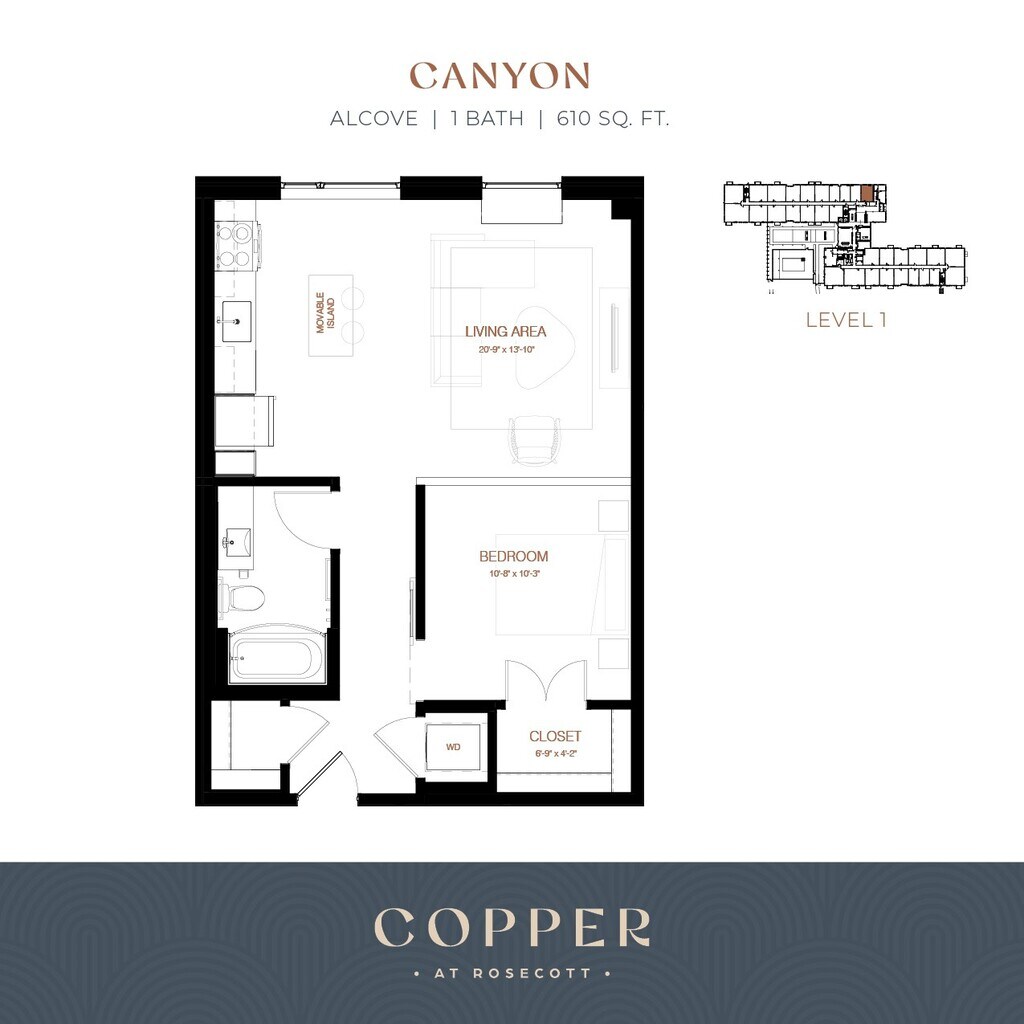 Canyon - ALCOVE - Floorplan 1 Apartment Unit: 121Apartment Model: Canyon - ALCOVE$1,545Studio, 1 Bath, 610 sq ftAvailable June 1, 2026Rose - Acc