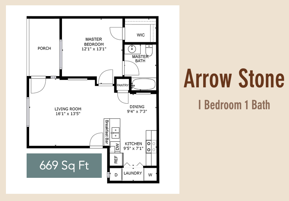 Apartment Model: Arrow StoneFrom $1,1601 Bedroom, 1 Bath, 669 sq ftAvailable NowFloorplansPhotos![]()