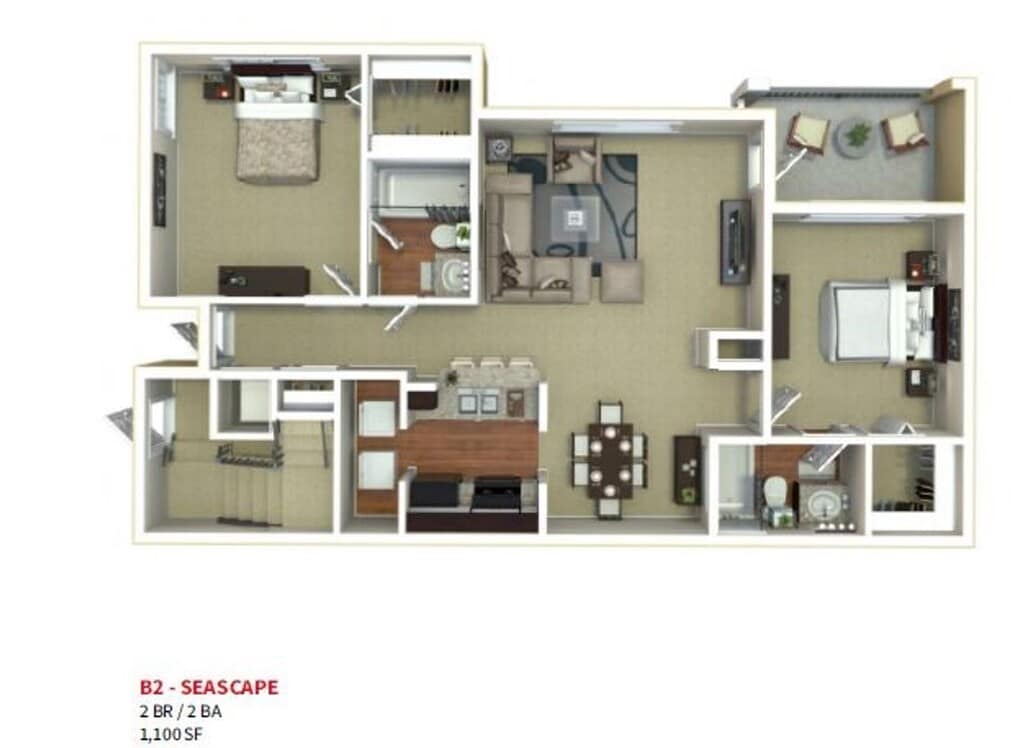 - 2 Bedrooms- B2 Seascape Premium- $2,3752 Beds, 2 Baths, 1100 sq ftAvailable Now- Model Gallery- Photos- Availability Details- Price - Availability Date - Unit - Sq Ft - Deposit - View Details - $2,375 - Available Now - 04107 - 1100 - $400 - $2,375 - November 18, 2025 - 16102 - 1100 - $400 - $2,375 - January 14, 2026 - 04106 - 1100 - $400 - Model Amenities and Features- Features- Air Conditioning