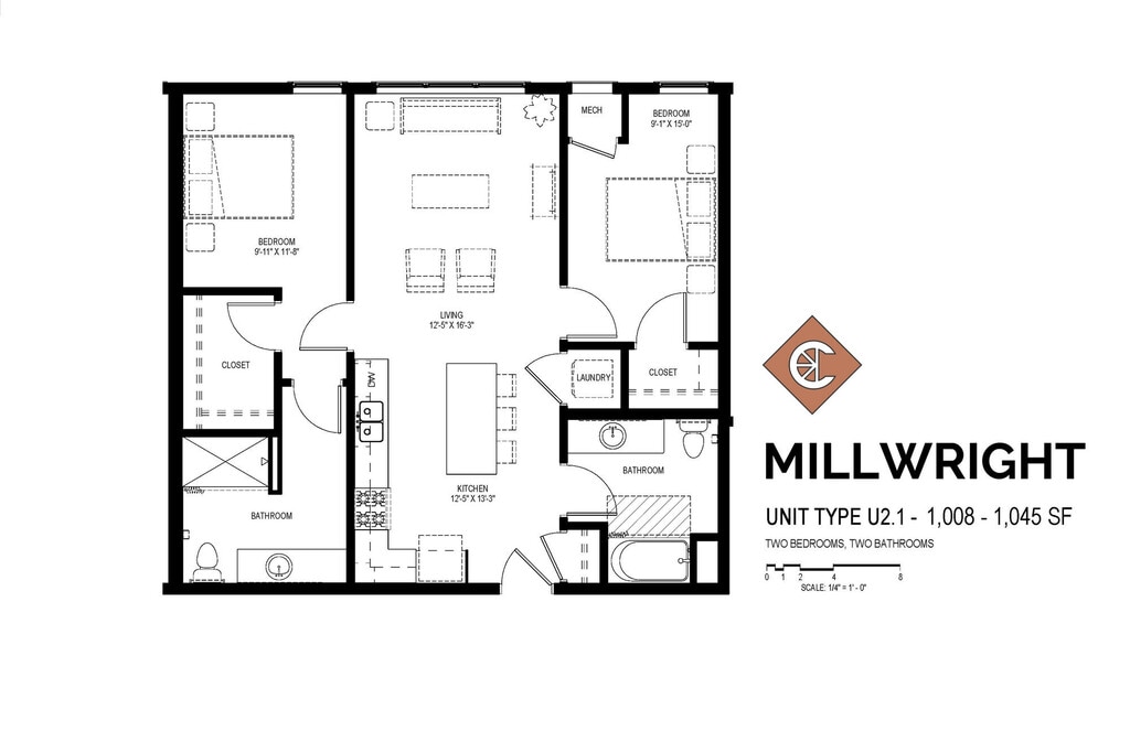 Apartment Model: MillwrightFrom $1,1532 Bedroom, 2 Bath, 1015-1045 sq ftAvailable Now![]()