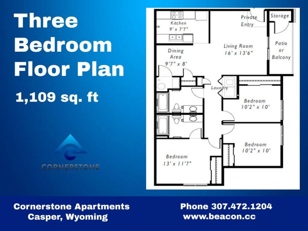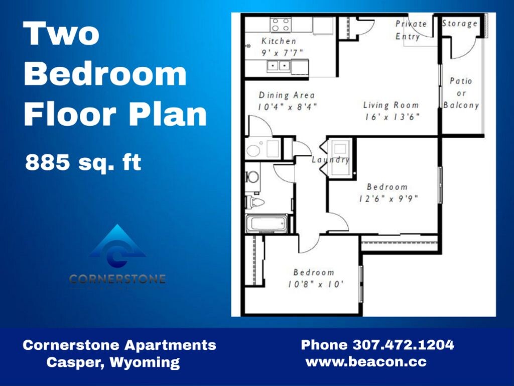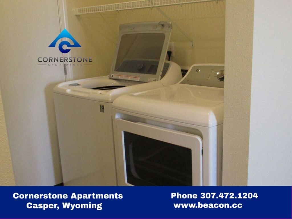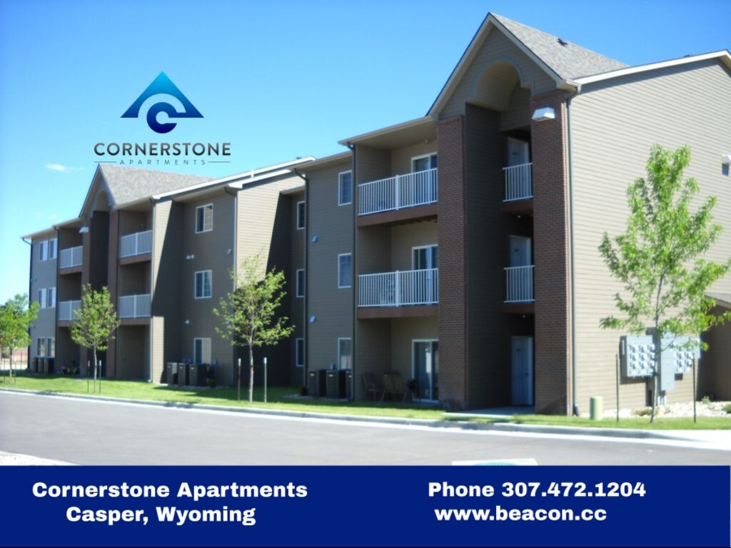 This Casper Wyoming community offers two and three bedroom apartments for rent Private entry, no common hallways Garages and one assigned off-street parking stall On-Site manager and 24 hour emergency maintenance Affordable .. Income limits apply please visit our website for up to date income guidelines at (3w's).beacon.cc/cornerstonecasper.html Apartments include: Full size washer and dryer connections in every home Fully equipped kitchens with self clean ovens, dishwasher & disposal Breakfast bars Large exterior balcony or patio with storage Dining area Custom fit window blinds Easy clean cabinetry Utilities Paid! Individual furnace, central air and hot water