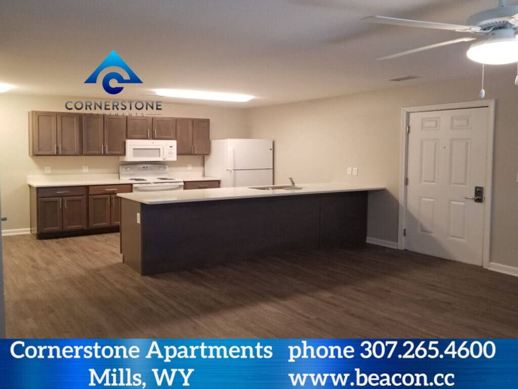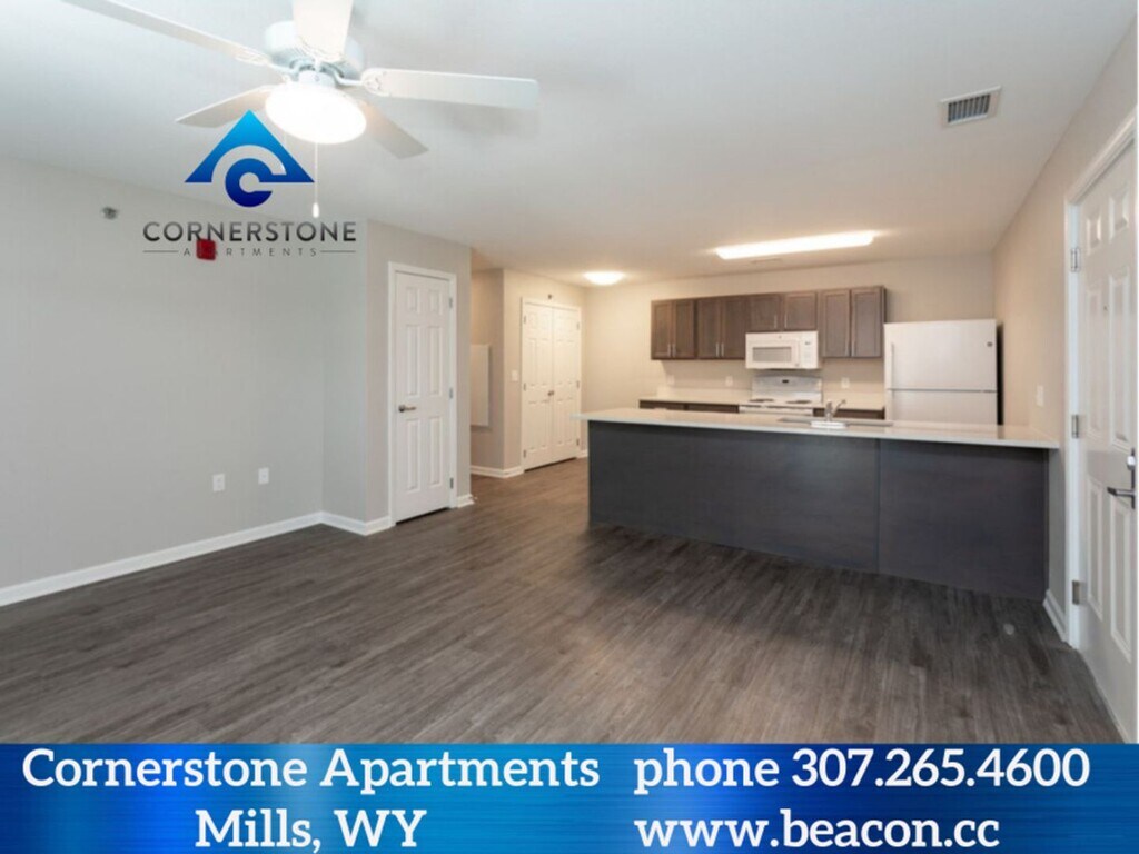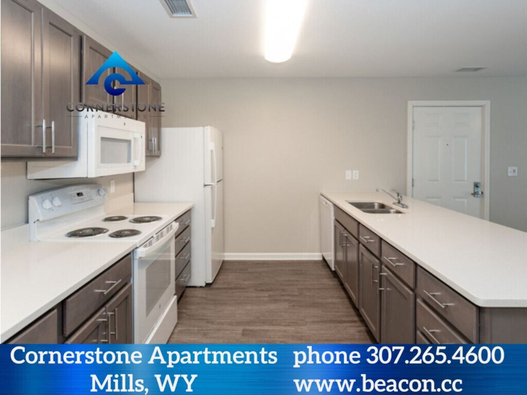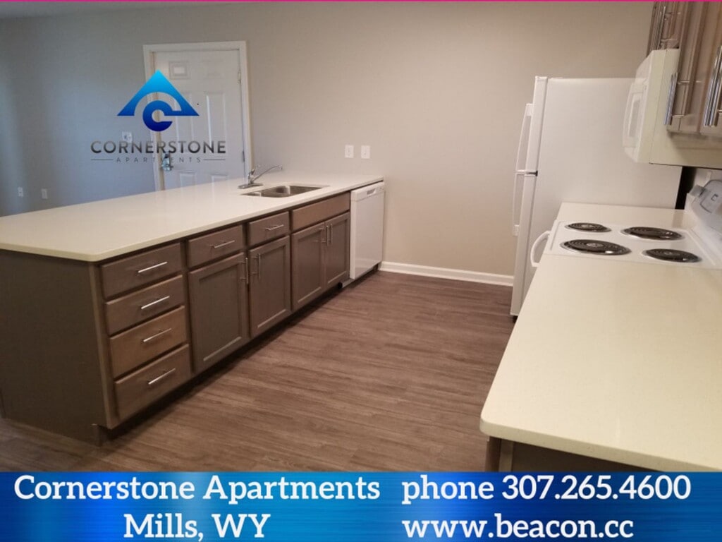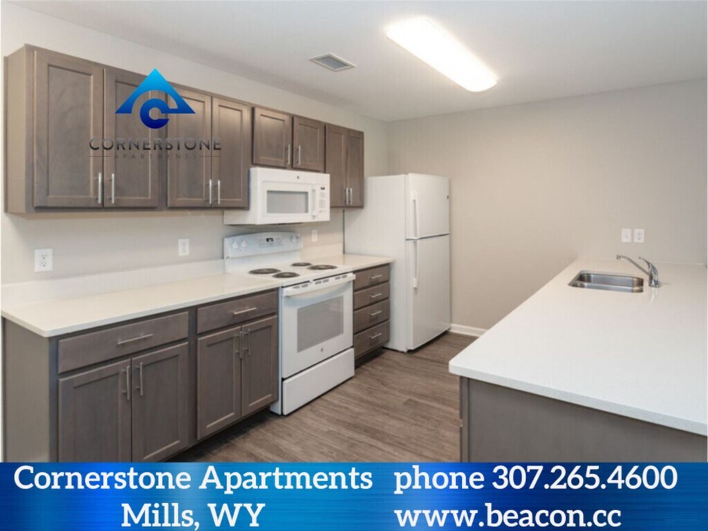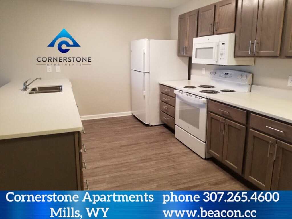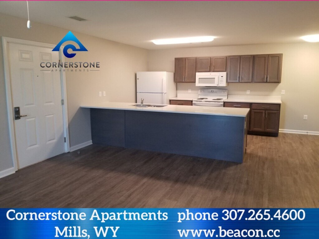 Brand new 66-unit apartment community. Located in Mills, WY (a suburb of Casper, Wyoming). One, Two, Three- and Four-bedrooms apartments. Apartments include a balcony/patio with storage closet, full size washer and dryer and a fully equipped kitchen with built in microwave. The apartments are all electric and the resident is responsible for the electric service. Floor coverings are faux wood tile flooring, and the bedrooms are carpeted. A large playground and garages are also found at Cornerstone. Cornerstone Apartments are located in Mills, WY at the intersection of Natrona Ave. and Poison Spider Rd. Call today to schedule a tour or see more at (3W’s) beacon.cc/cornerstonemills.html