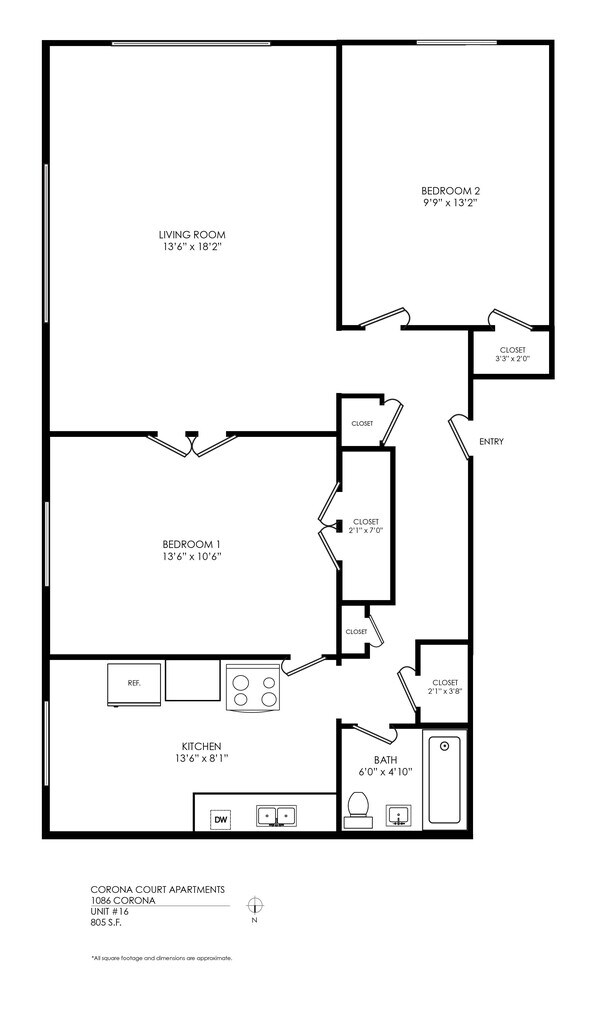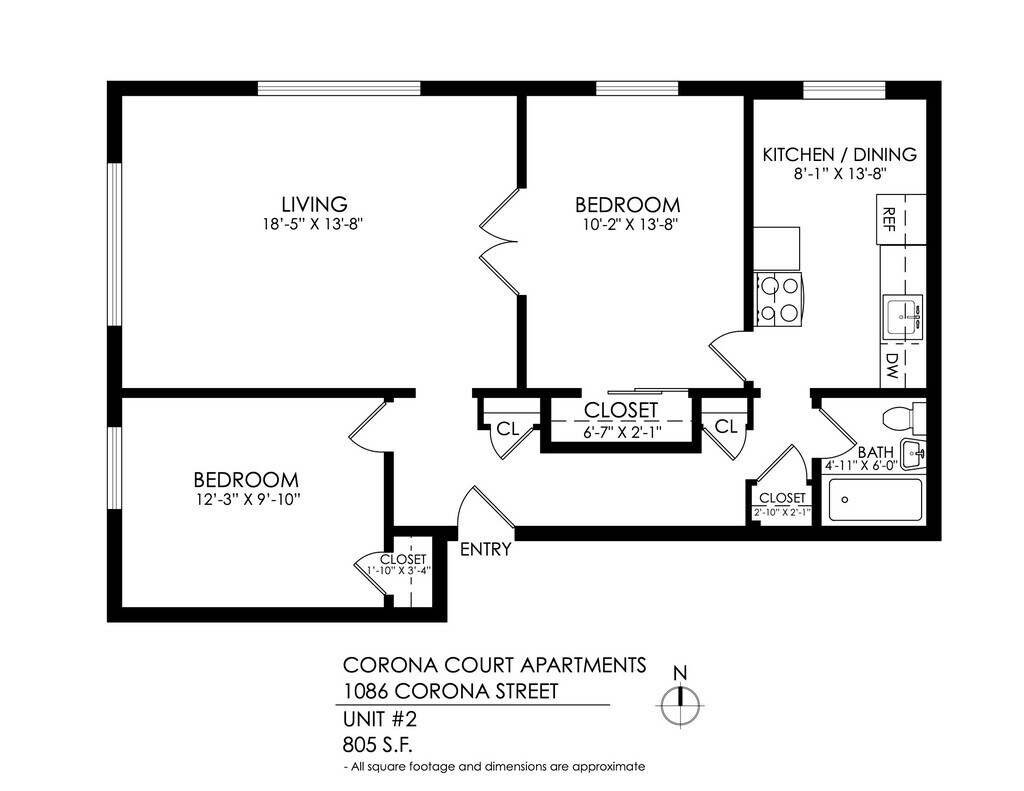 2 Bed x 1 Bath - Floorplan 5 Apartment Unit: 16Apartment Model: 2 Bed x 1 Bath2 Bedroom, 1 Bath, 805 sq ftAvailable Now![]()