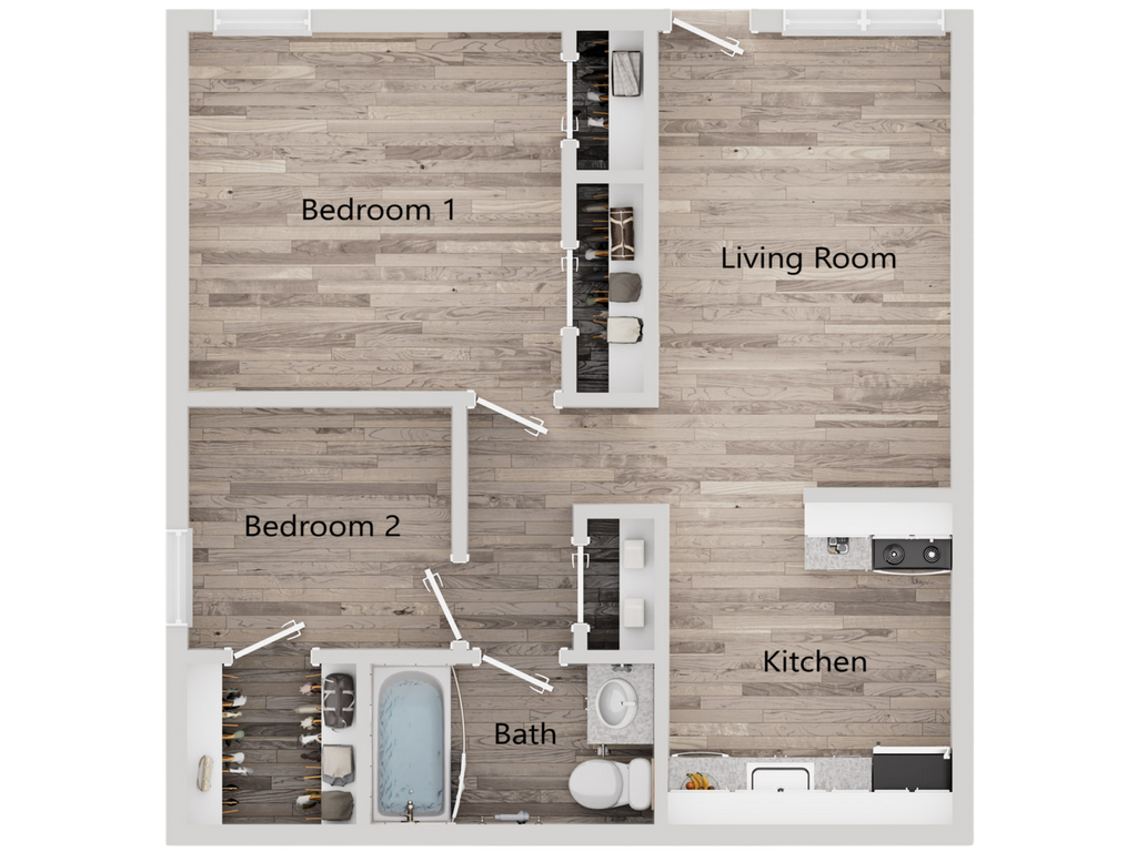 2 Beds, 1 Bath, 692 sq ftAvailable NowModel Gallery