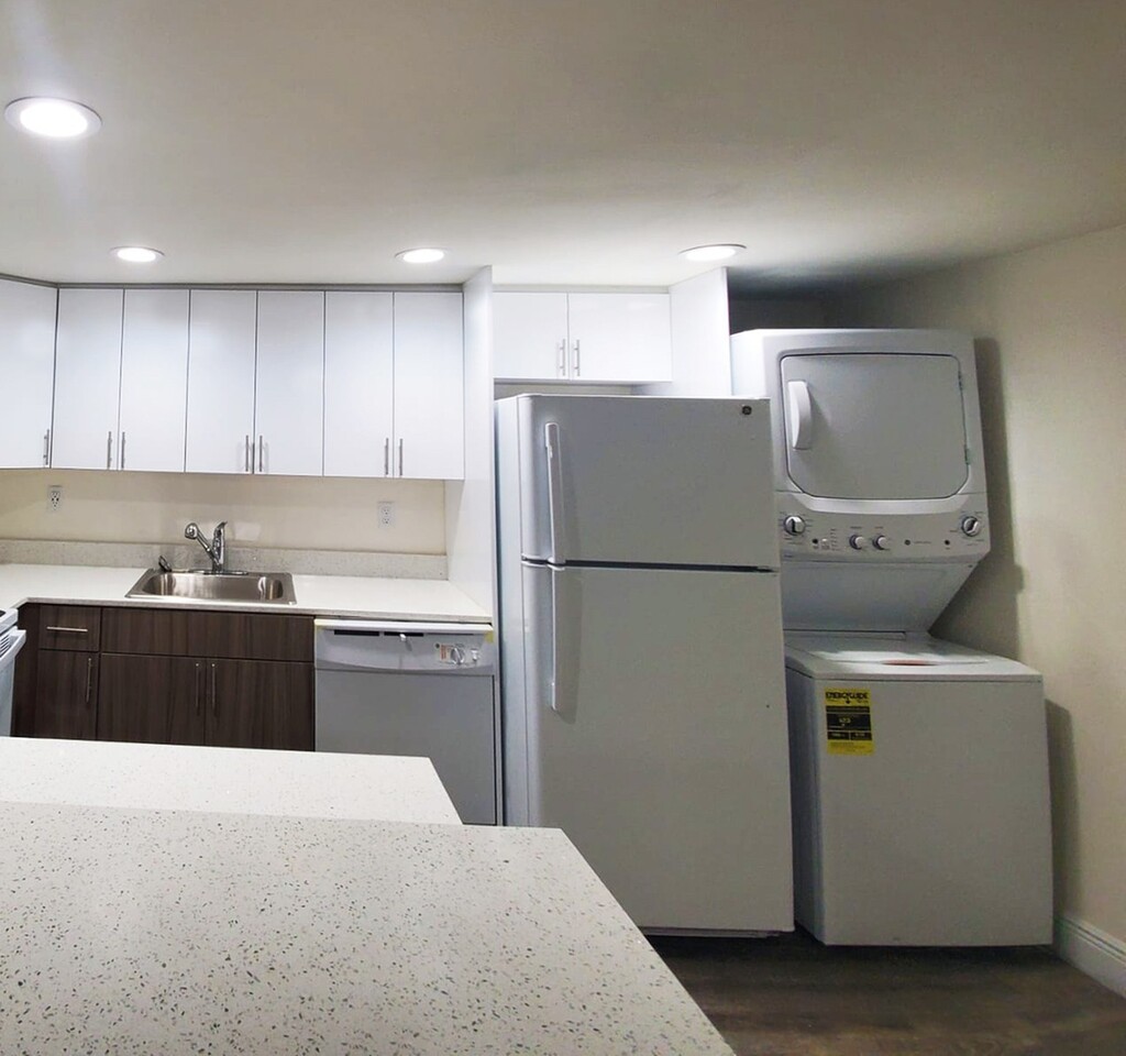 - Granite/Quartz Countertops with Modern, White European-Style Cabinetry With Self-Closing Hinges