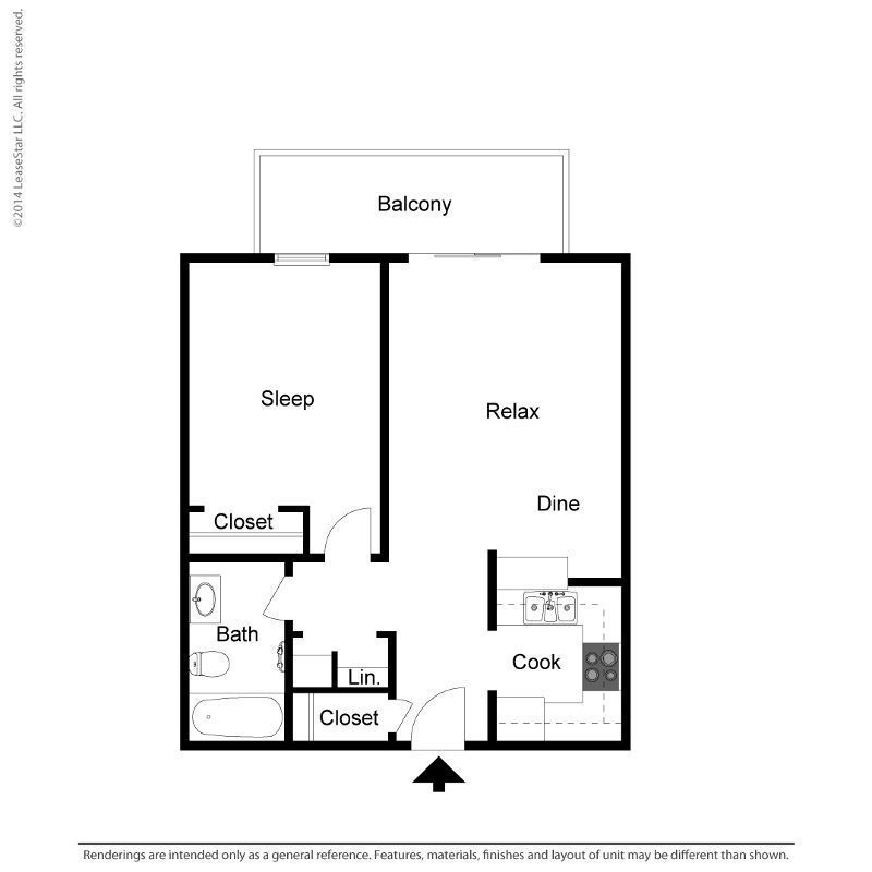 Apartment Model: Medium 1 Bed 1 BathFrom $1,7991 Bedroom, 1 Bath, 584 sq ftAvailable NowFloor plans are artist's rendering. All dimensions are approximate. Actual product and specifications may vary in dimension or detail. Not all features are available in every rental home. Prices and availability are subject to change. Base rent is based on monthly frequency. Additional fees may apply, such as but not limited to package delivery, trash, water, amenities, etc. Deposits vary. Please see a representative for details.
