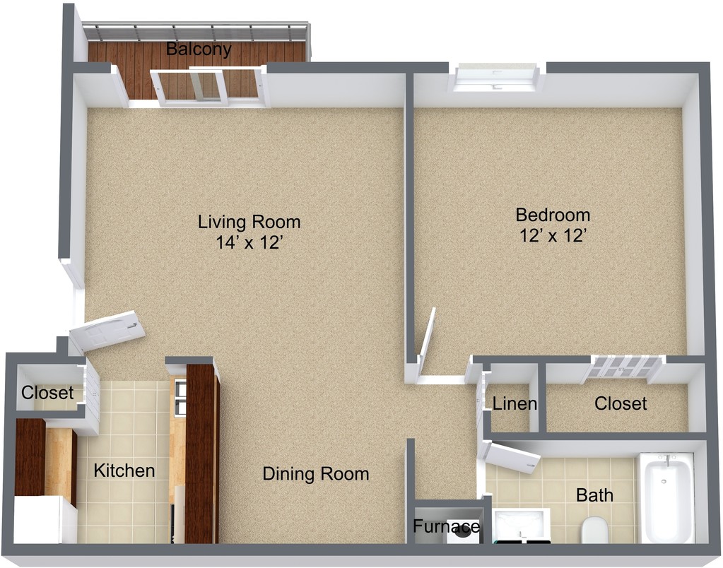 Apartment Model: 1 Bed Balcony$9001 Bedroom, 1 Bath, 640 sq ftAvailable Now1 Bed Balcony - Floorplan 1 2 Bedrooms