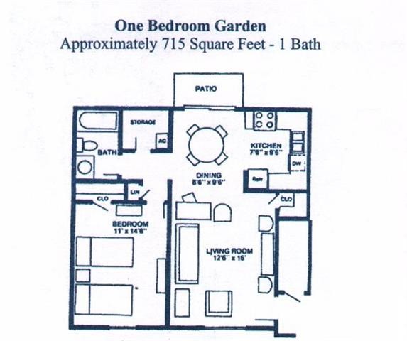ONE BEDROM GARDEN - Floorplan 1 Apartment Unit: 97-5449CApartment Model: ONE BEDROM GARDEN$9151 Bedroom, 1 Bath, 715 sq ftAvailable Now2 Bedrooms