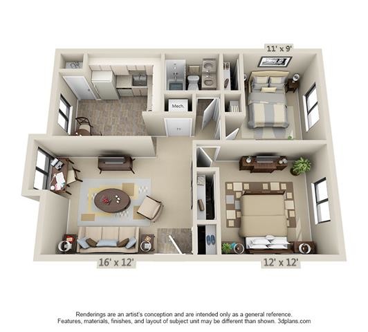 Apartment Model: 2 BedroomCall For Rates2 Bedroom, 1 Bath, 720 sq ftAvailable Now![]()