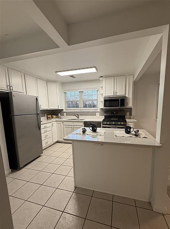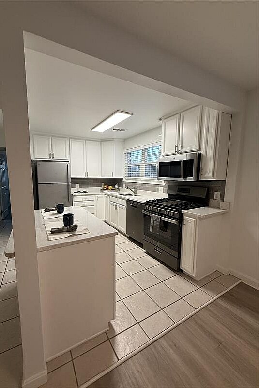 - Stylish modern kitchen with sleek white cabinetry, stainless steel appliances, and a cozy dining set