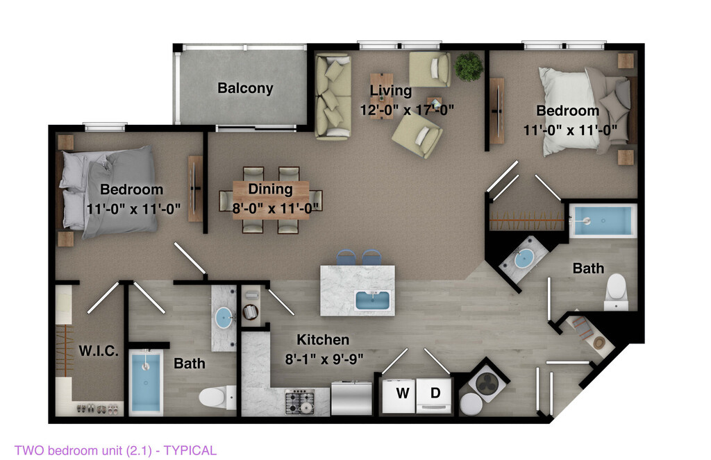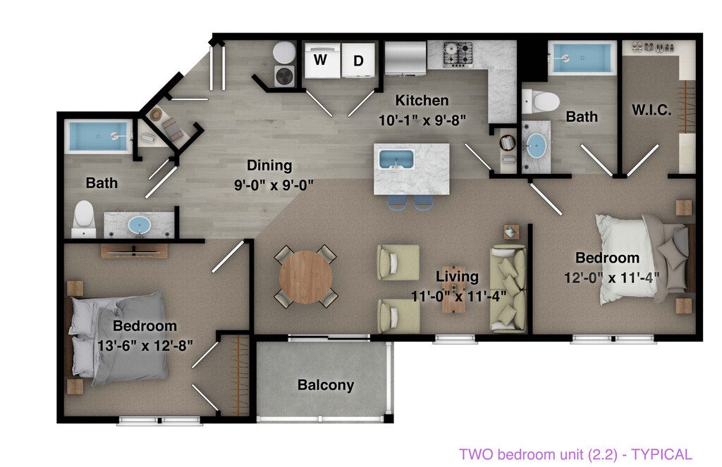 2 Beds, 2 Baths, 1093 sq ftAvailable NowLargest 2 BedroomThis is the largest 2 Bedroom at this PropertyModel Gallery