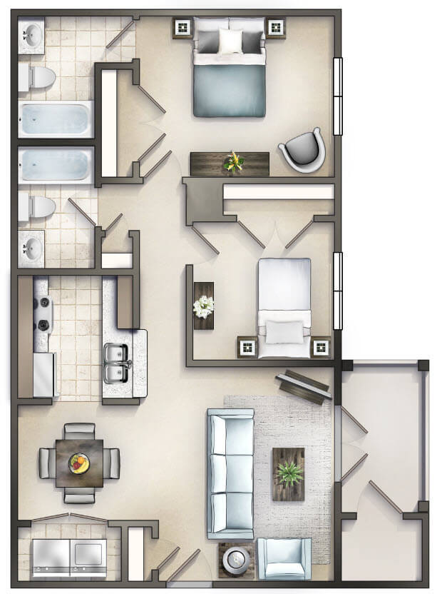 2 Beds, 2 Baths, 960 sq ftAvailable NowModel Gallery