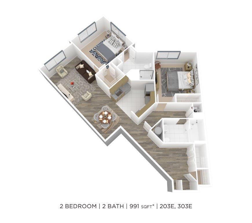 Two Bedroom 2 Bath- 991 sqft - Floorplan 2 Apartment Unit: 203EApartment Model: Two Bedroom 2 Bath- 991 sqft$3,1302 Bedroom, 2 Bath, 991 sq ftAvailable NowTwo Bedroom 2 Bath w/ Den- 1275 sqft