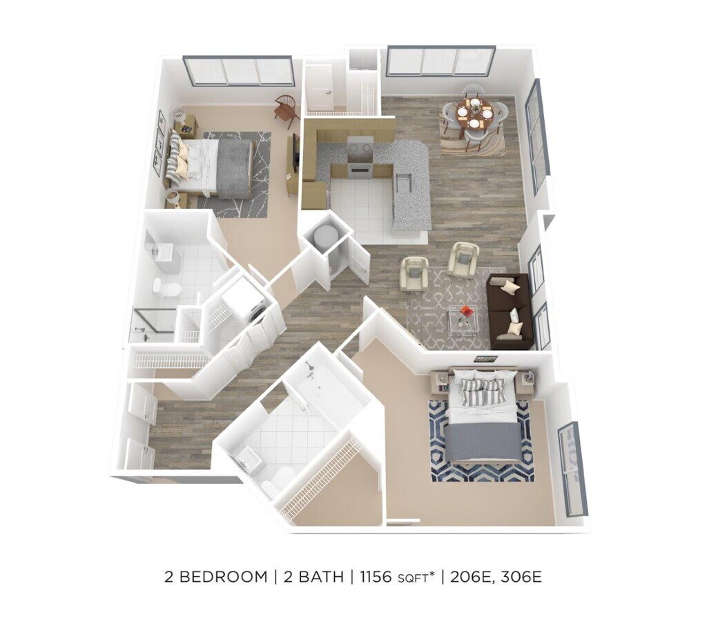 Two Bedroom 2 Bath - 1,155 sqft - Floorplan 2 Apartment Unit: 210EApartment Model: Two Bedroom 2 Bath - 1,155 sqft$3,2502 Bedroom, 2 Bath, 1155 sq ftAvailable December 1, 2025Two Bedroom 2 Bath - 1,154 sqft