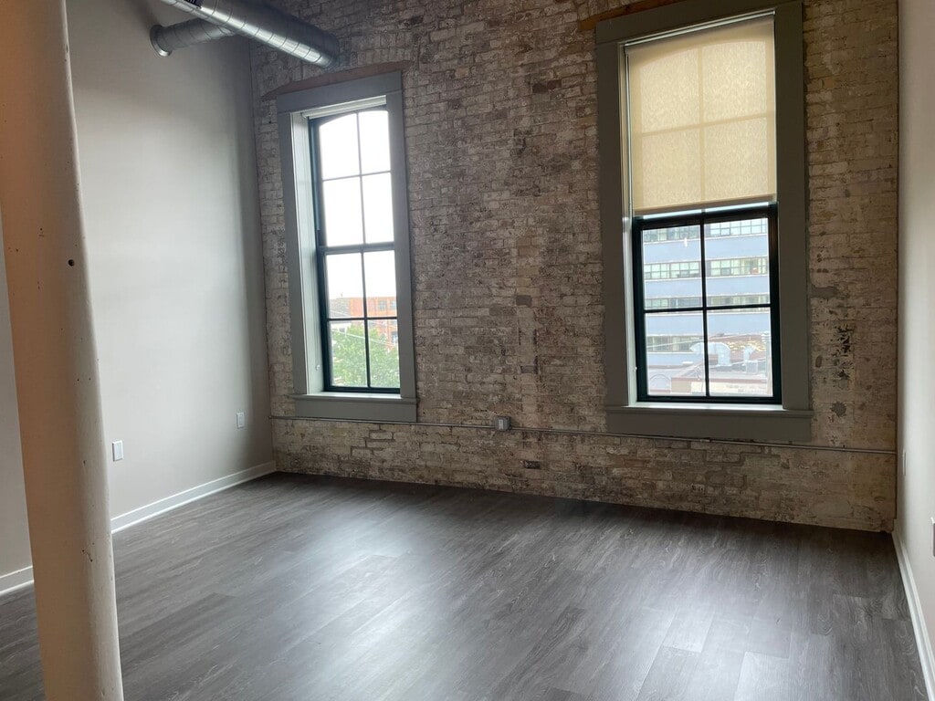 A historic rehab - the building features soaring ceilings with timber beams and exposed cream city brick walls. The community offers an on-site fitness center, top floor atrium "sun room", and an expansive rooftop deck with 360-views of downtown Milwaukee and Lake Michigan. This 2-bedroom / 1-bath floor plan offers great south views. The kitchen features granite counters, island with room for barstools, tile backsplash and undercabinet lighting. One bedroom offers a large walk-in closet and ceiling fan, the other bedroom has exposed cream city brick and south views. Bathroom offers a walk-in shower with glass door. Contact our leasing team today to schedule a tour!