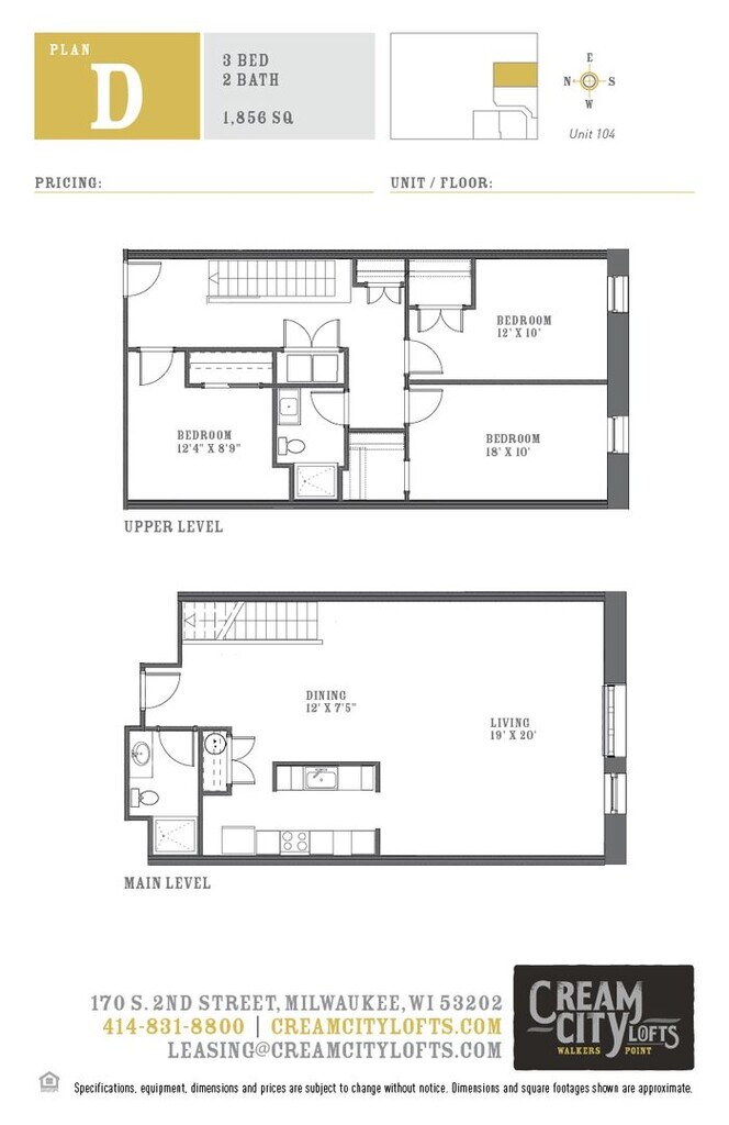 D - Floorplan 11 Apartment Unit: Cream City Lofts-104Apartment Model: D$2,9953 Bedroom, 2 Bath, 1856 sq ftAvailable Now