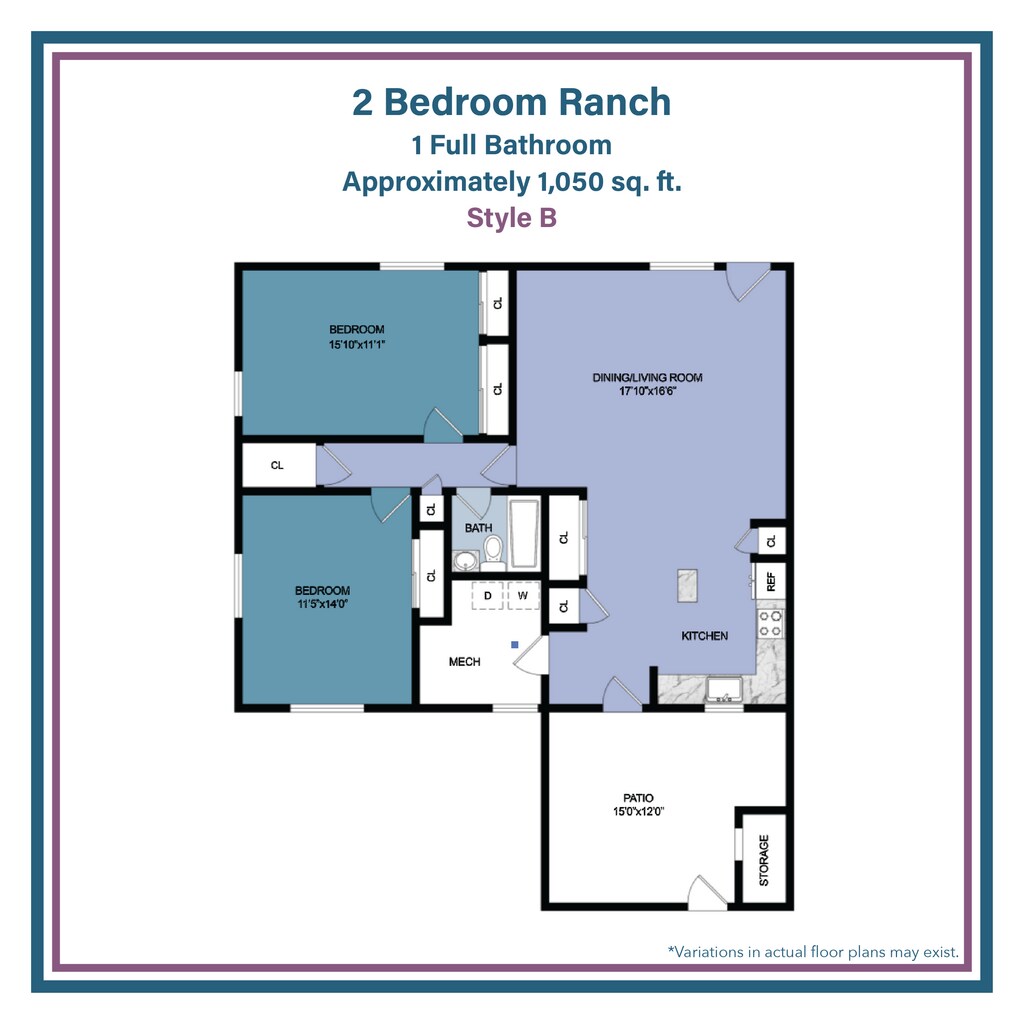 2 Bedrooms, 1 Bathroom - Ranch Style B - Floorplan 3 ![]()