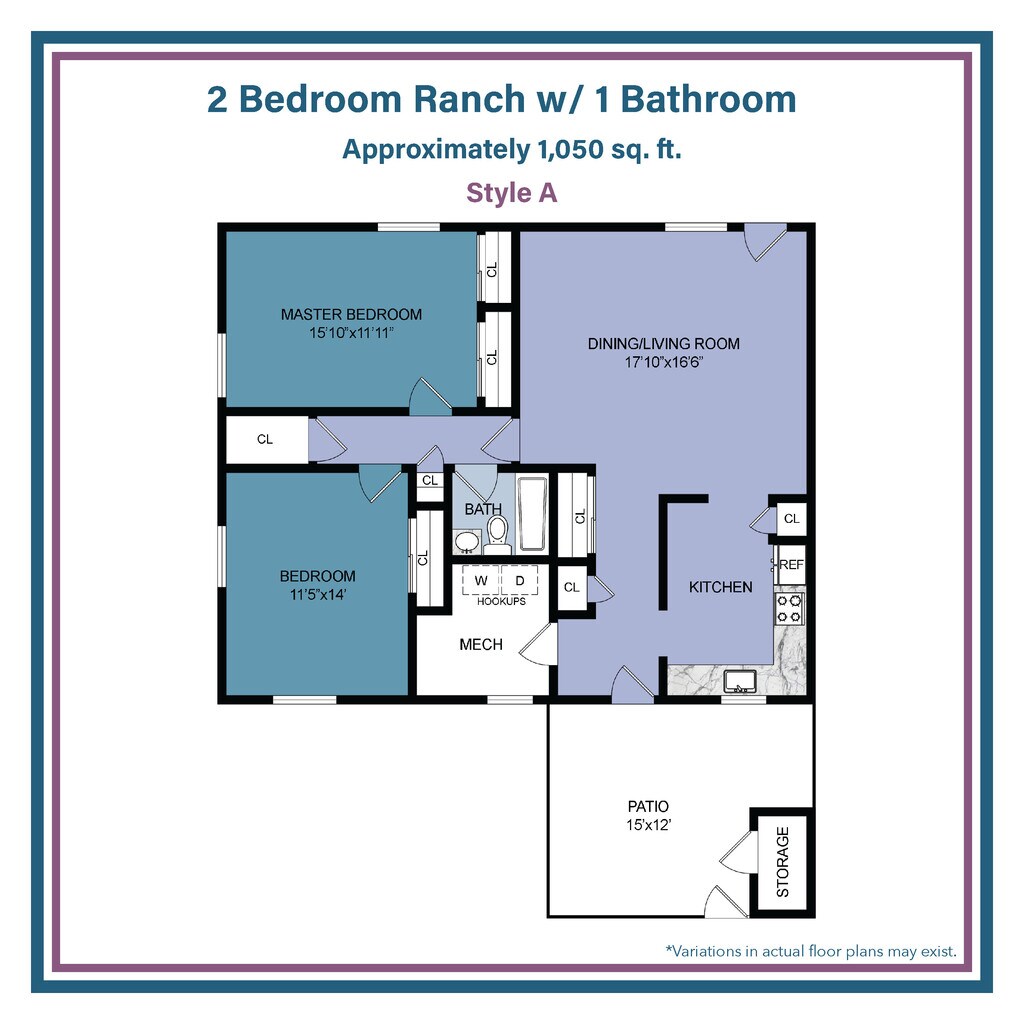 2 Bedrooms, 1 Bathroom - Ranch Style A - Floorplan 2 ![]()