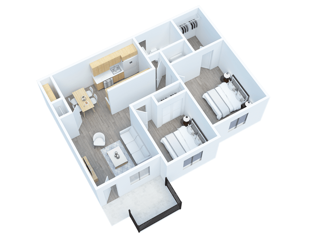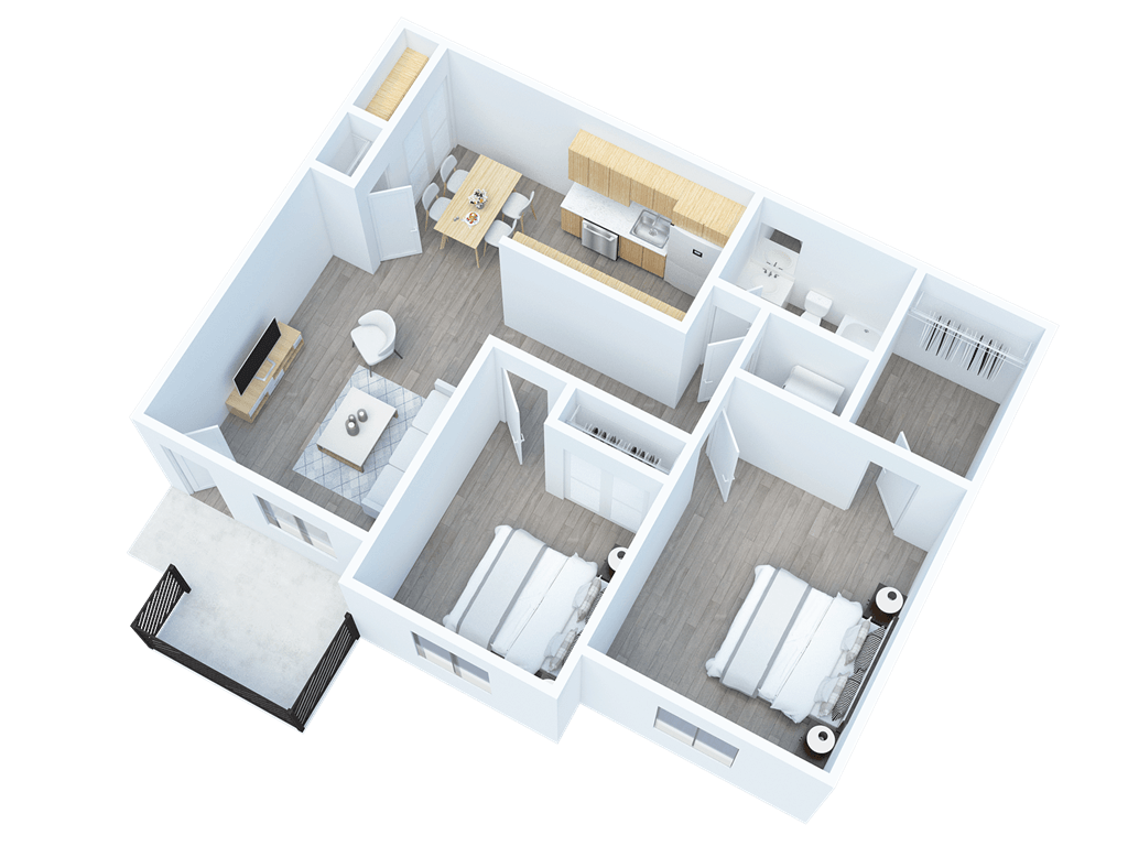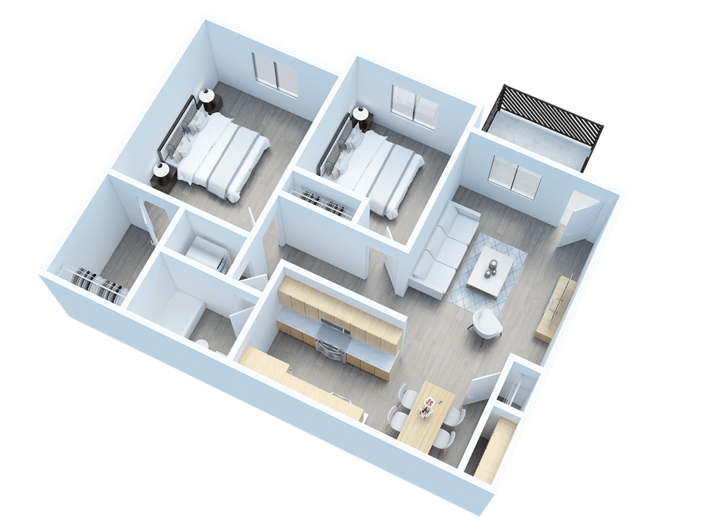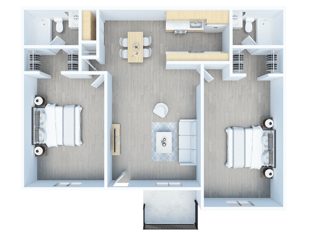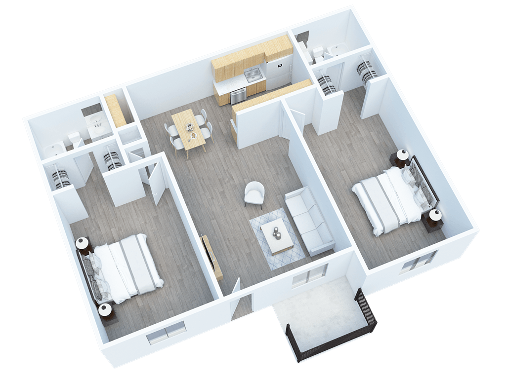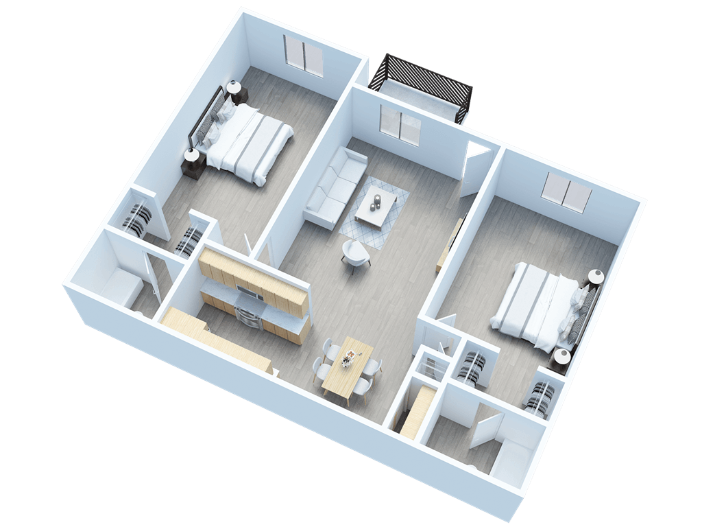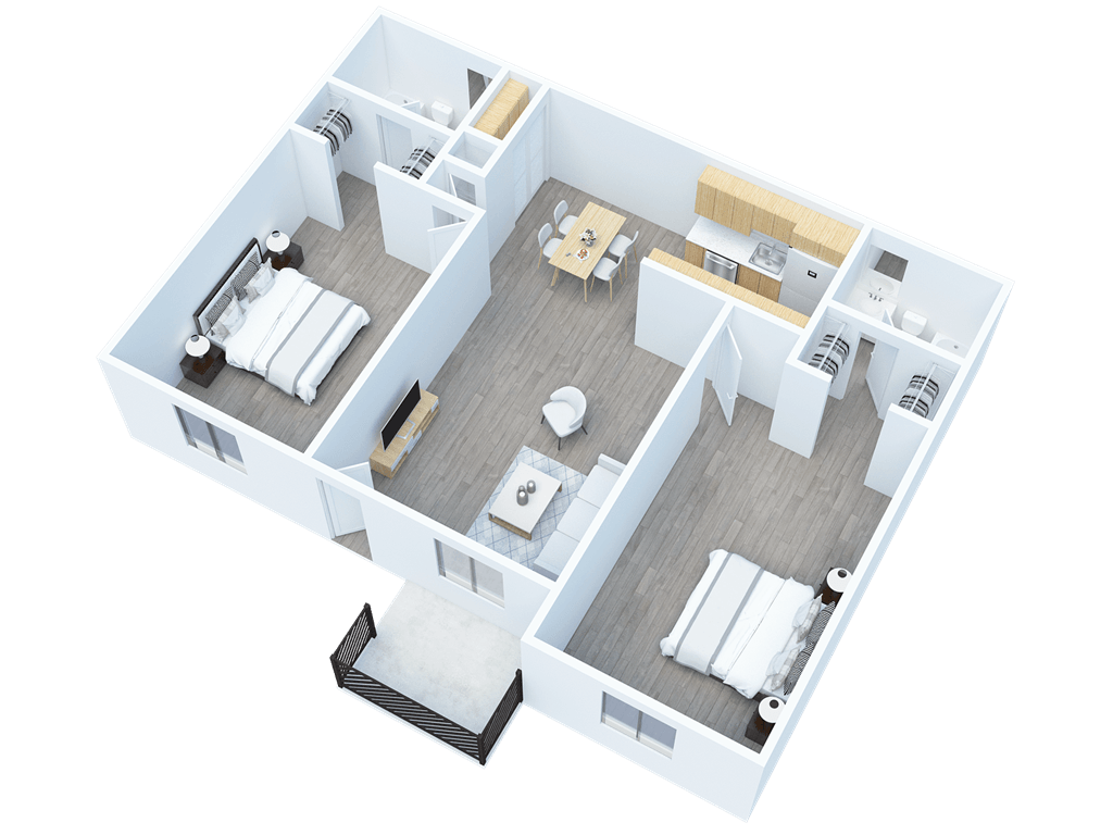 Two Bed Two Bath - Floorplan 5 Apartment Unit: J10Apartment Model: Two Bed Two Bath$1,9162 Bedroom, 2 Bath, 910 sq ftAvailable NowTwo Bed One Bath