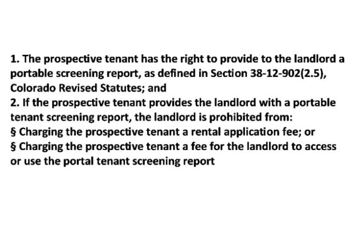 Applicant has the right to provide the property manager or owner with a Portable Tenant Screening Report (PTSR) that is not more than 30 days old, as defined in § 38-12-902(2.5), Colorado Revised Statutes; and 2) if Applicant provides the property manager or owner with a PTSR, the property manager or owner is prohibited from: a) charging Applicant a rental application fee; or b) charging Applicant a fee for the property manager or owner to access or use the PTSR.