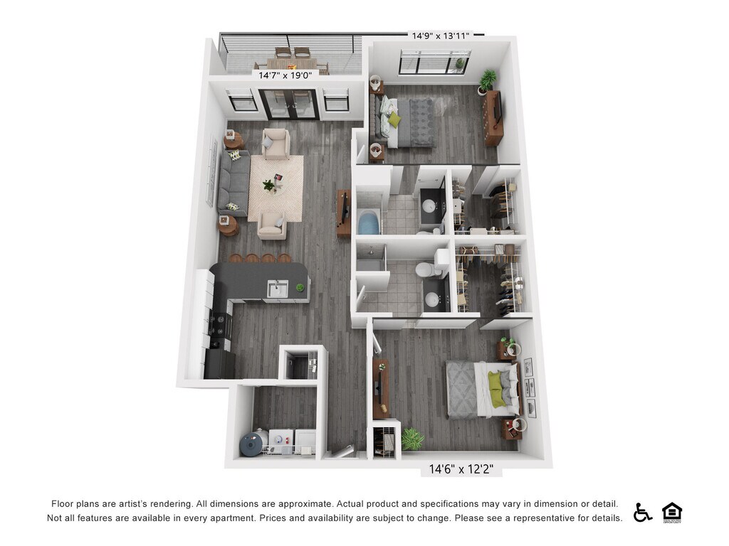 E2 - Floorplan 1 Floor plans are artist's rendering. All dimensions are approximate. Actual product and specifications may vary in dimension or detail. Not all features are available in every rental home. Prices and availability are subject to change. Base rent is based on monthly frequency. Additional fees may apply, such as but not limited to package delivery, trash, water, amenities, etc. Deposits vary. Please see a representative for details.
