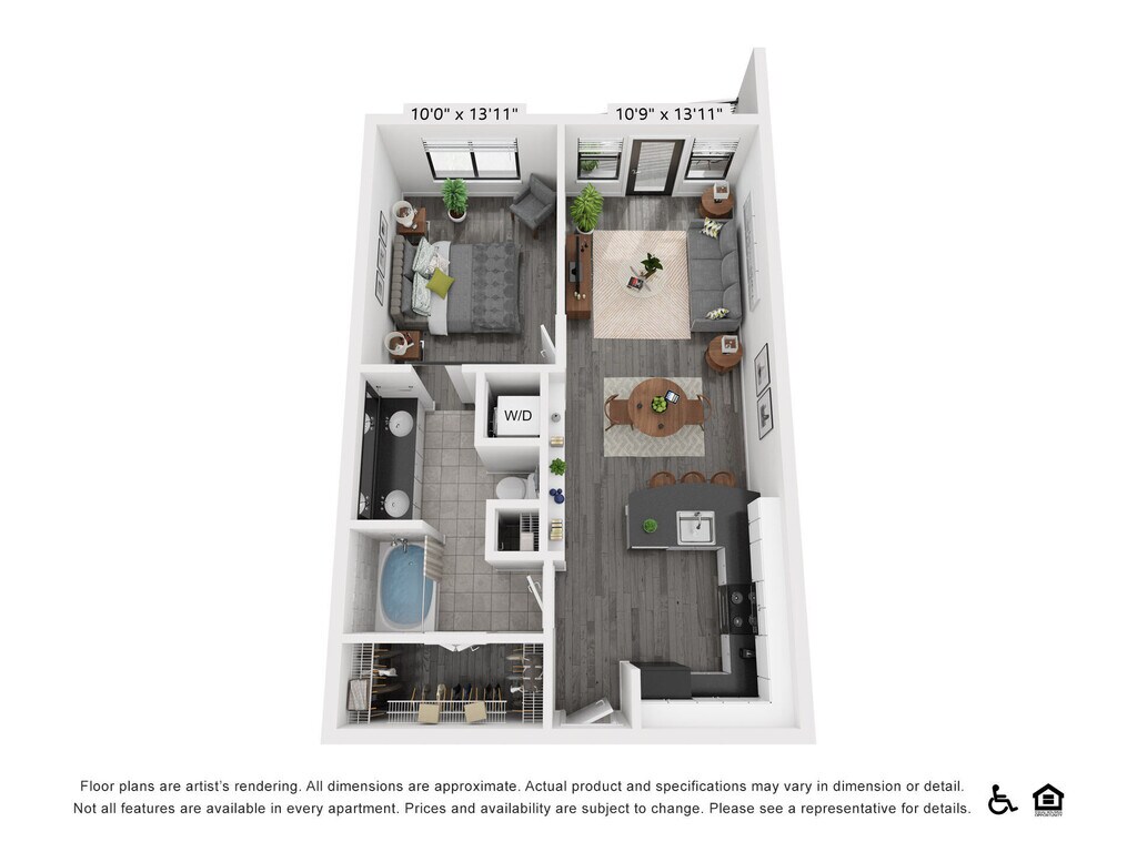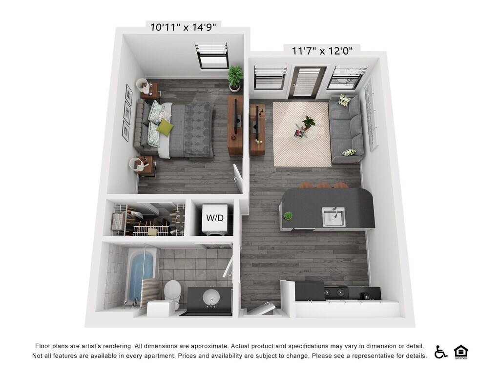 Apartment Model: E1From $1,297Studio, 1 Bath, 392 sq ftAvailable NowFloor plans are artist's rendering. All dimensions are approximate. Actual product and specifications may vary in dimension or detail. Not all features are available in every rental home. Prices and availability are subject to change. Base rent is based on monthly frequency. Additional fees may apply, such as but not limited to package delivery, trash, water, amenities, etc. Deposits vary. Please see a representative for details.