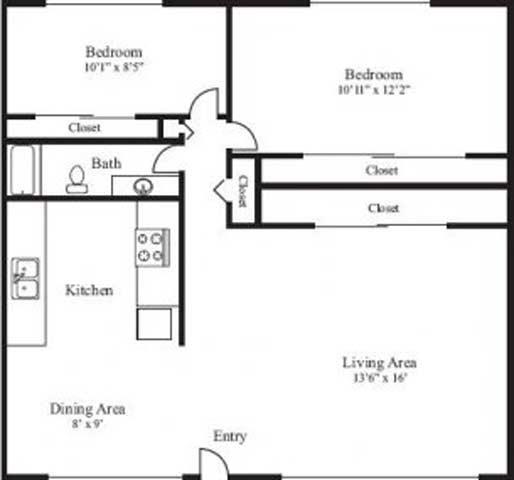Apartment Model: 2 Beds 1 Bath SmallCall For Rates2 Bedroom, 1 Bath, 850 sq ftUnavailable2 Beds 1 Bath Small - Floorplan 1