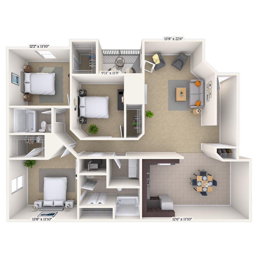 Apartment Model: 1BR 1BA (1200 SF)From $1,3051 Bedroom, 1 Bath, 1200 sq ftAvailable Now![]()