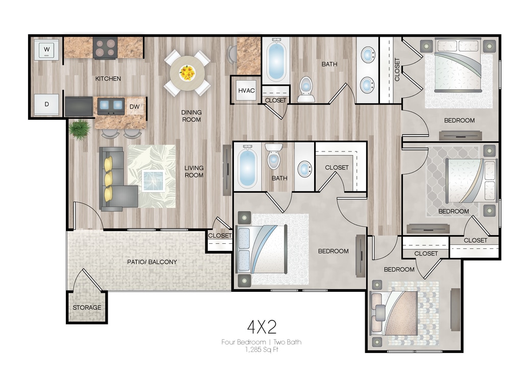 4x2 - Floorplan 1 Apartment Unit: 411Apartment Model: 4x2$1,3074 Bedroom, 2 Bath, 1285 sq ftAvailable November 28, 2025