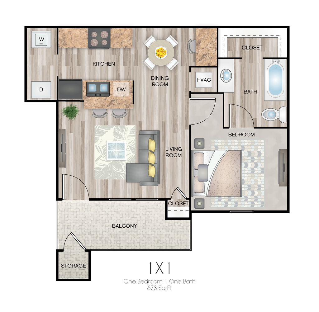 Apartment Model: 1x1From $9251 Bedroom, 1 Bath, 673 sq ftAvailable Now![]()