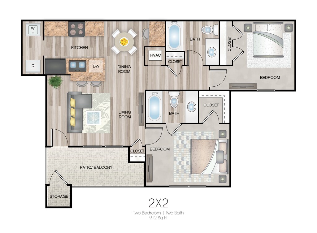 Apartment Model: 2x2From $1,1352 Bedroom, 2 Bath, 912 sq ftAvailable Now![]()