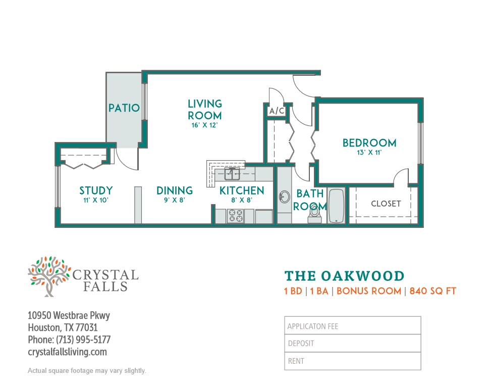 The Pinebrook - Floorplan 1 Apartment Unit: 3203Apartment Model: The Pinebrook$1,2501 Bedroom, 1 Bath, 715 sq ftAvailable NowThe Oakwood
