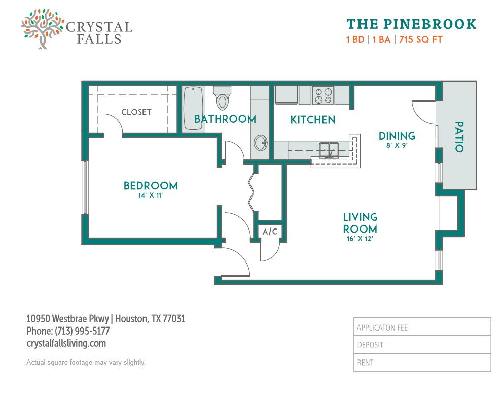 Apartment Model: The Pinebrook$1,2501 Bedroom, 1 Bath, 715 sq ftAvailable Now![]()