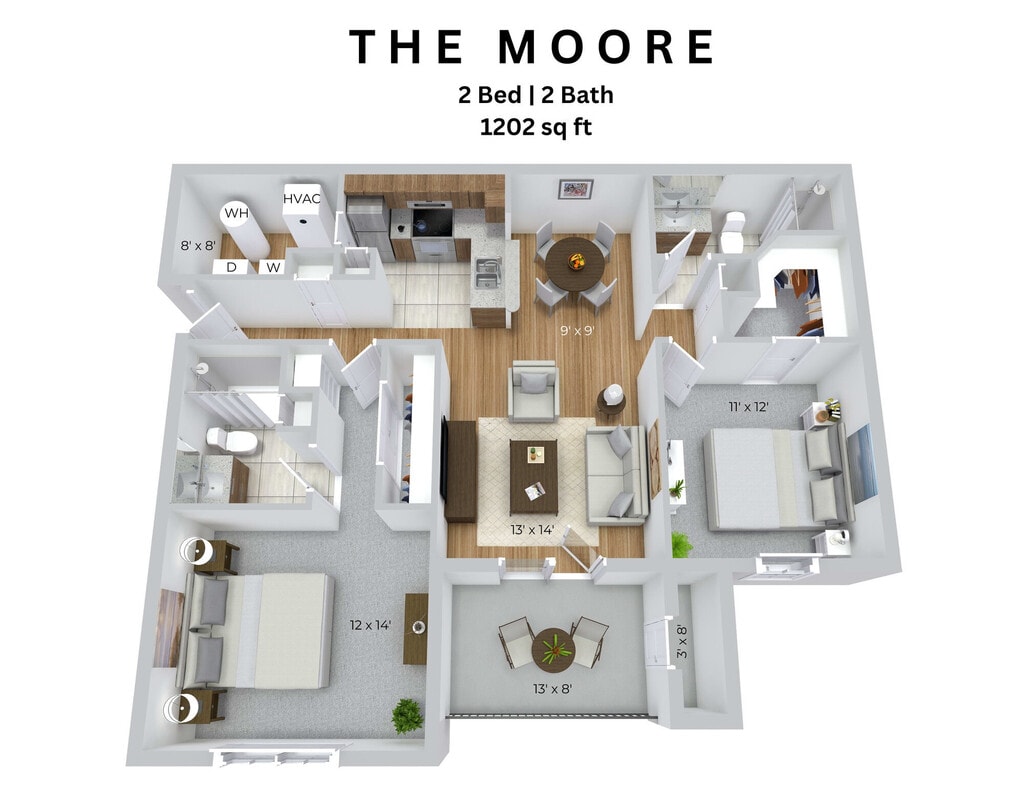 Apartment Model: Moore$1,2502 Bedroom, 2 Bath, 1202 sq ftAvailable January 10, 2026![]()
