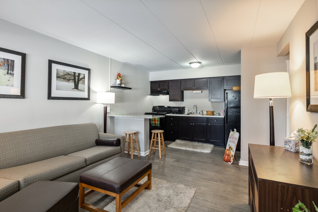 Newly Remodeled Suites: 1 bedroom 1 bathroom modern units located in Stow, OH. Our bathroom and kitchen have been remodeled and include all new appliances. Amenities include on site Laundry, covered outside lounge areas with Adirondack chairs, picnic tables and bike racks, a dog park and pavilions. The facility is surrounded by woods giving it a serene park like setting. Great location! Walking distance to Work and everything you need. This property is conveniently located within walking distance of Giant Eagle and Meijers supermarkets, Panera Bread, Swenson’s, Kohl’s department store, Target, Drug Mart, Chase Bank and Summa Health Stow-Kent Medical Center. Just a 10 min drive to Kent State University and 20 minutes from the University of Akron. Ample parking, 2 spaces per unit.