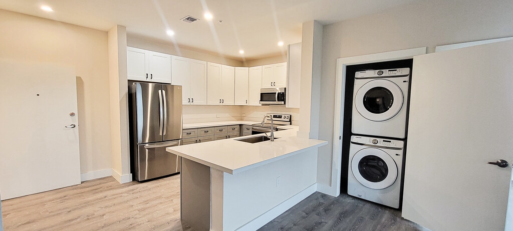 Beautiful Newer Apartments featuring large kitchens with Quartz countertops and stainless steel appliances, full size in-unit washer and dryer, and wood laminate floors. Mixed-use buildings with commercial spaces on the first floor and residential apartments on the 2nd thru 4th floors. Newly Built 3rd Building with 3 bedroom, 2 bathroom apartments NOW AVAILABLE! Call or email for details and to schedule a showing. This building includes 2 covered parking spaces. Stair access only. Custom built-in closets. Spacious kitchen with ample storage and pantry.