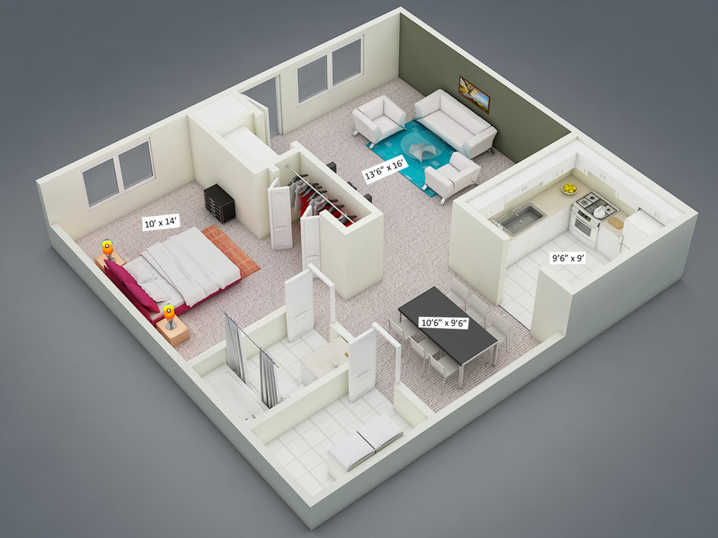 1 Bed, 1 Bath, 728 sq ftModel Gallery