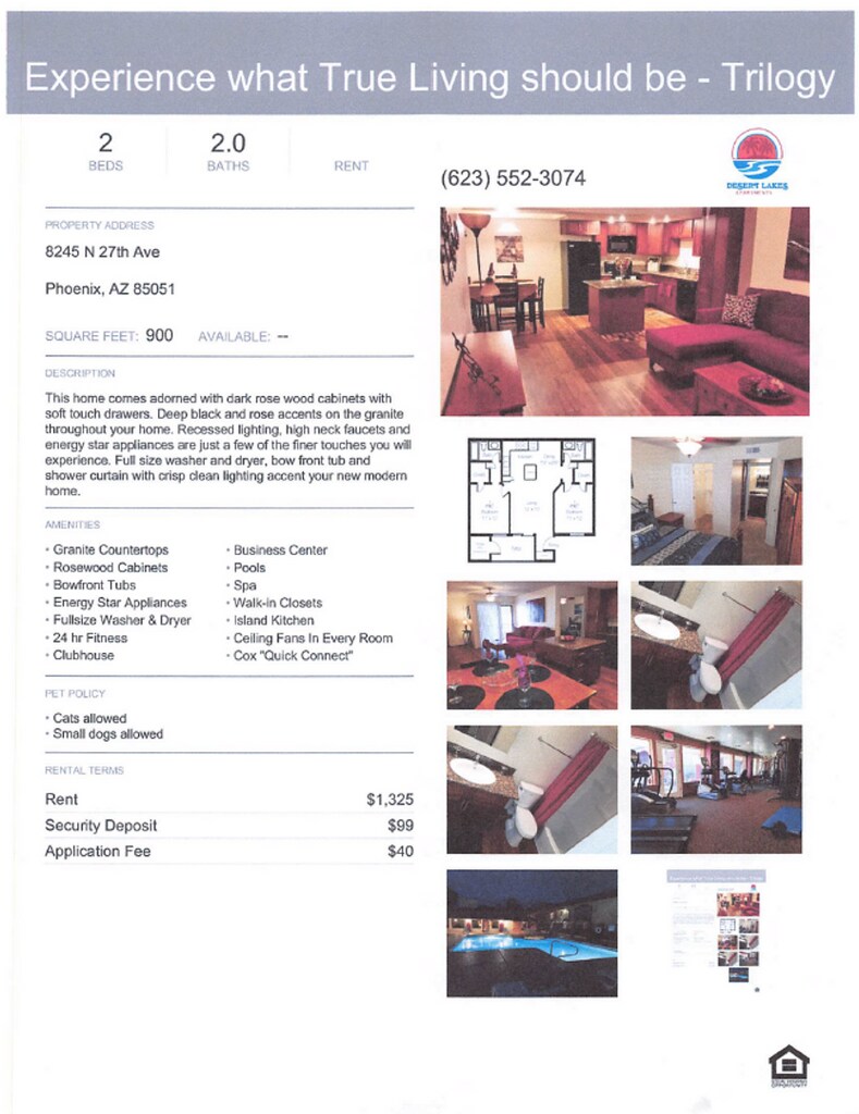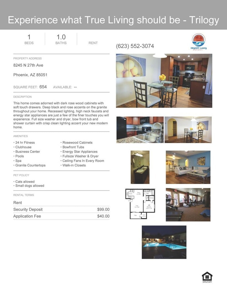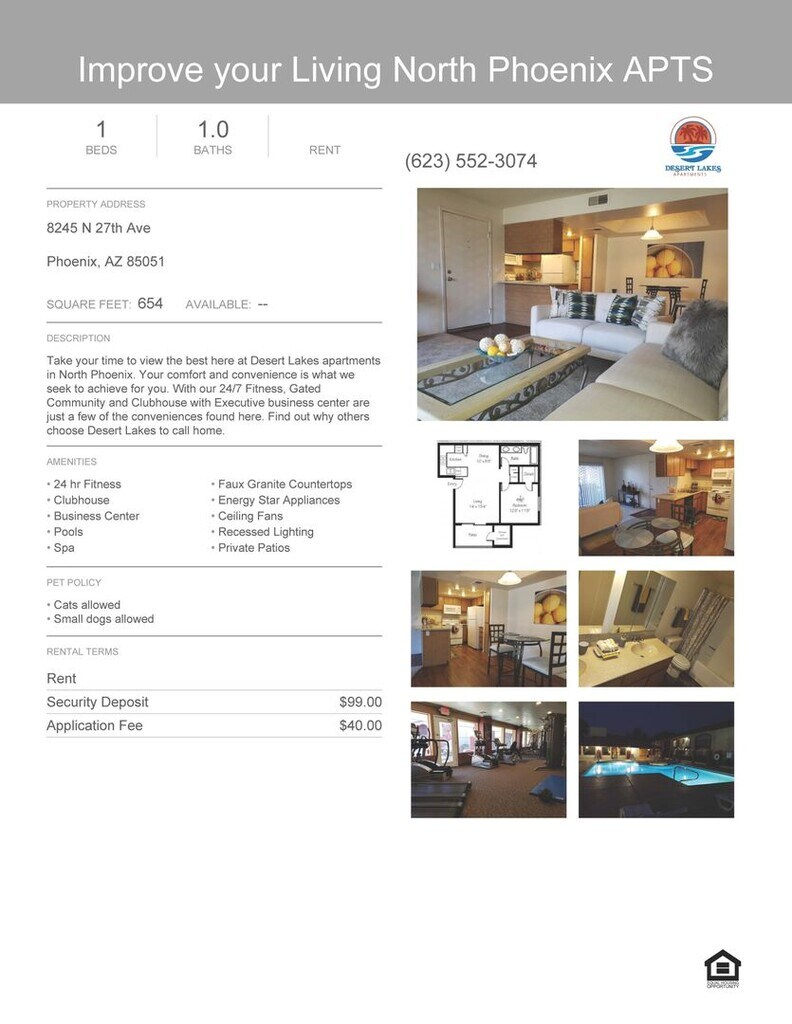 October 16, 2019Desert lakes is an awesome place to stay, so quiet, green and clean at all times, easy access to main roads such as 27th ave and northern n I-17 is a big plus. I just love it. Proud to call it my home.Review from Apartments.com