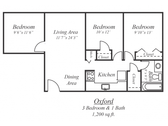 Apartment Model: The OxfordCall For Rates3 Bedroom, 1 Bath, 1200 sq ftUnavailable![]()