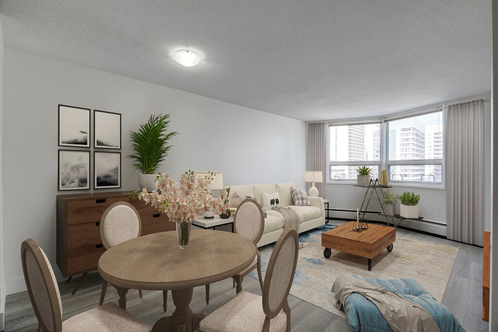 Experience the vibrant lifestyle of Downtown Calgary by making District your home. Our community offers a variety of floor plans to fit your lifestyle, ranging from newly renovated options to classic layouts, with one to two-bedroom choices available. At District, convenience is part of the lifestyle. The complex is designed to ensure you can effortlessly enjoy downtown Calgary's offerings. On-site amenities include a standard gym and a grocery store within the complex for your daily needs. Plus, with a bus and C-train station just 2 minutes away, shops within a 5-minute reach, and easy access to Plus 15 Skywalk system in 4 minutes, you're perfectly positioned to reduce your commute time and immerse yourself in Calgary's core.