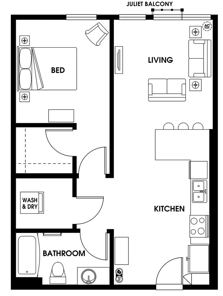 Micro Flat M1 - Floorplan 1 Apartment Unit: A106Apartment Model: Micro Flat M1$1,695Studio, 1 Bath, 315 sq ftAvailable Now1 Bedroom