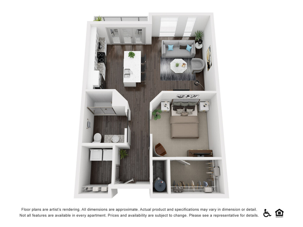 A1- District Lofts - Floorplan 1 Floor plans are artist's rendering. All dimensions are approximate. Actual product and specifications may vary in dimension or detail. Not all features are available in every rental home. Prices and availability are subject to change. Base rent is based on monthly frequency. Additional fees may apply, such as but not limited to package delivery, trash, water, amenities, etc. Deposits vary. Please see a representative for details.