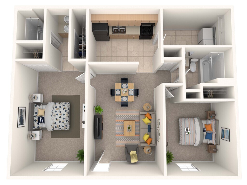 Apartment Model: 2 Bed 2 BathFrom $7802 Bedroom, 2 Bath, 864 sq ftUnavailable![]() - 2 Bed 2 Bath - Floorplan 1