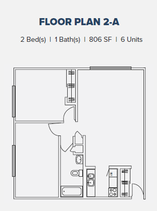 Two Bed - 2A - Floorplan 1 Apartment Unit: 212Apartment Model: Two Bed - 2A$1,4952 Bedroom, 1 Bath, 806 sq ftAvailable NowApartment Unit: 202Apartment Model: Two Bed - 2A$1,5952 Bedroom, 1 Bath, 806 sq ftAvailable NowTwo Bed - 2D