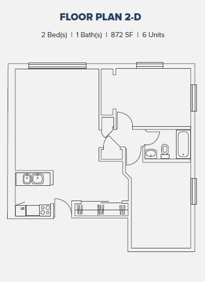 Two Bed - 2D - Floorplan 1 Apartment Unit: 110Apartment Model: Two Bed - 2D$1,4952 Bedroom, 1 Bath, 872 sq ftAvailable NowApartment Unit: 220Apartment Model: Two Bed - 2D$1,5952 Bedroom, 1 Bath, 872 sq ftAvailable NowTwo Bed - 2C